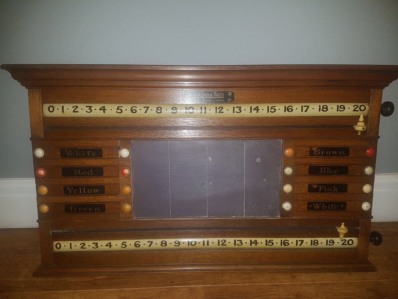 Here we have an very old and rare Burroughes & Watts life pool score board in Oak.